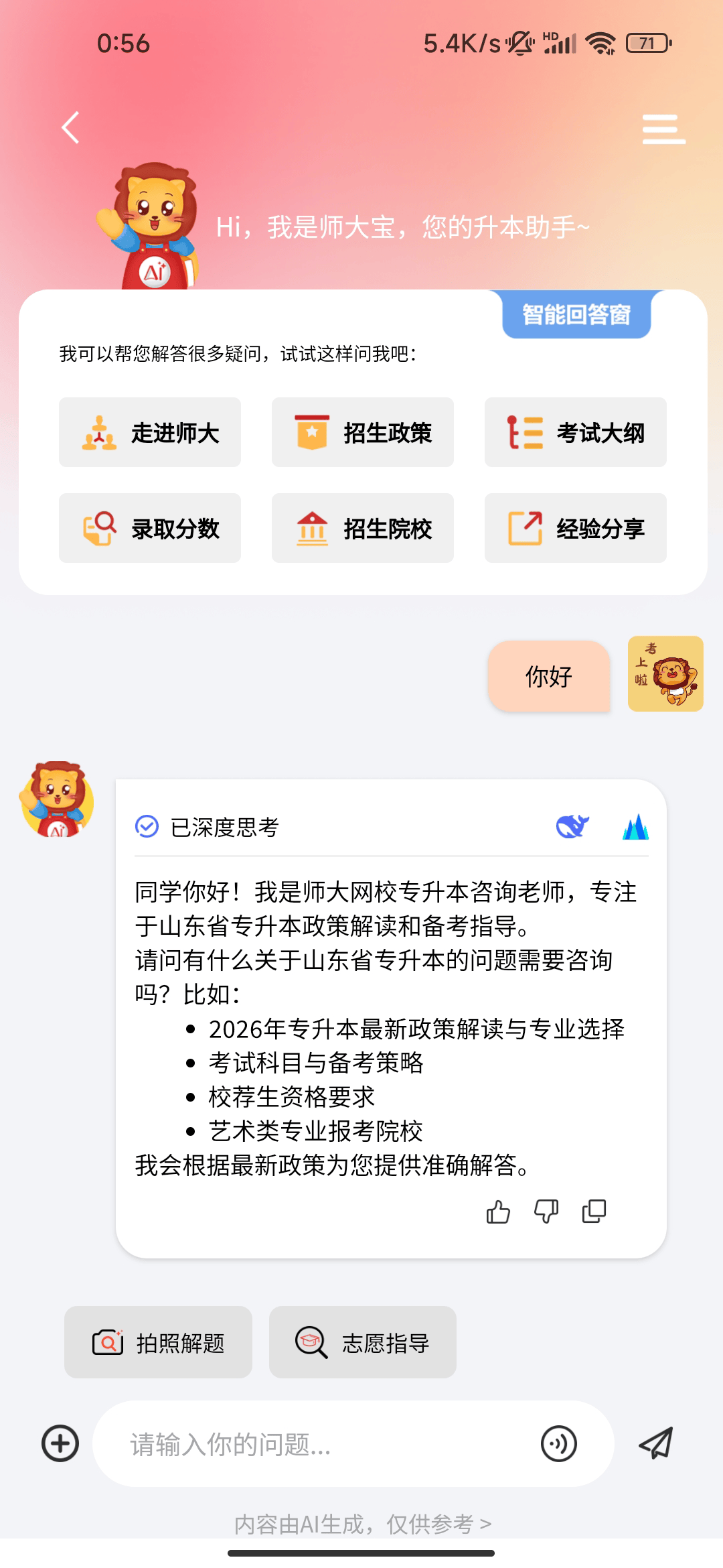 AI科技赋能师大宝AI智能体、AI答疑、AI批改、AI阅卷、AI个性化推题,一站式智能助学。让每一份努力都有回应,科技为笔,书写更高效的升本未来!