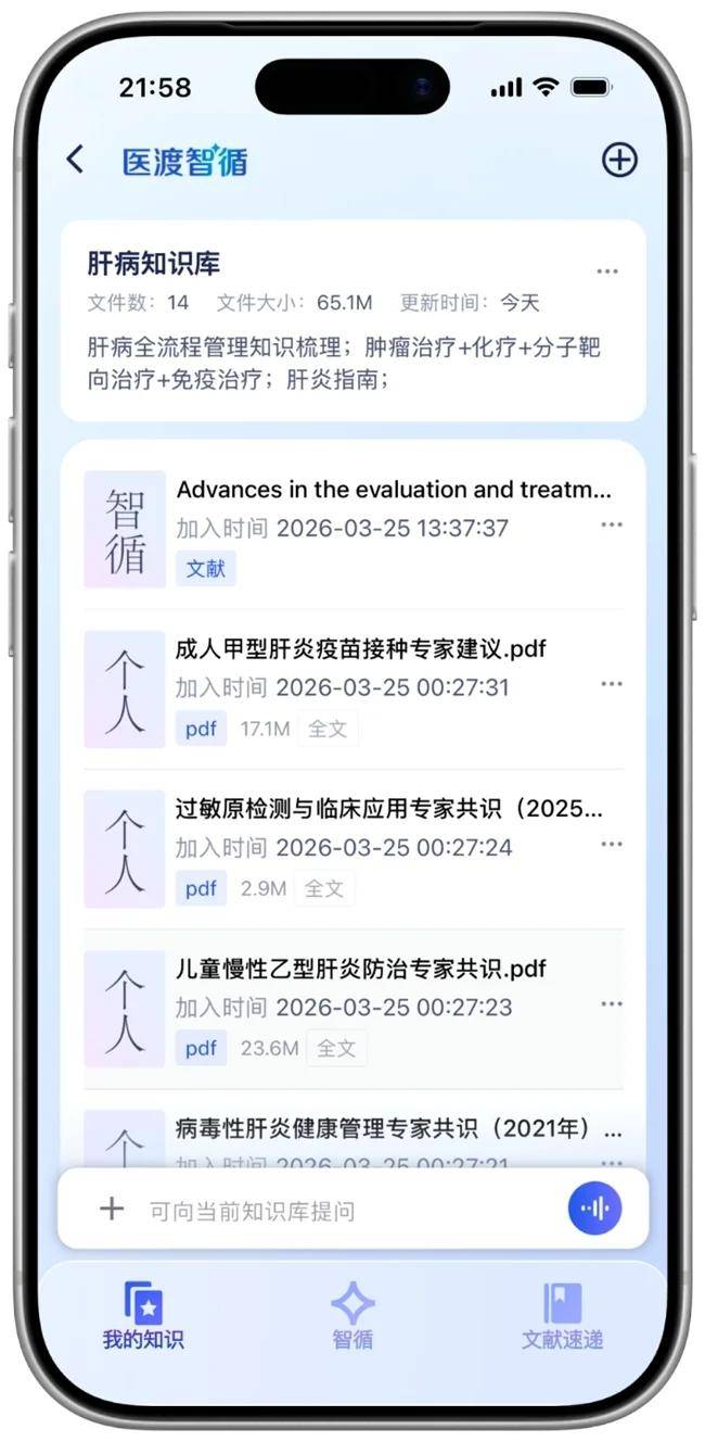 更贴心的是,“个人知识库”功能如同专属“移动书房”,支持医生收藏、上传认可的指南文献,按个人习惯分类整理及提问,形成个性化知识空间。