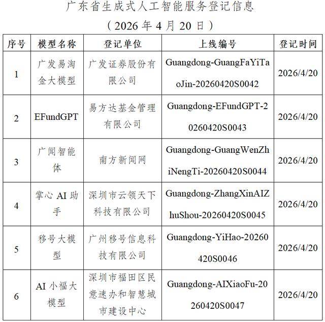 财联社4月20日电,据“网信广东”消息,截至4月20日,广东省新增6款已完成登记的生成式人工智能服务,累计已完成47款生成式人工智能服务登记。