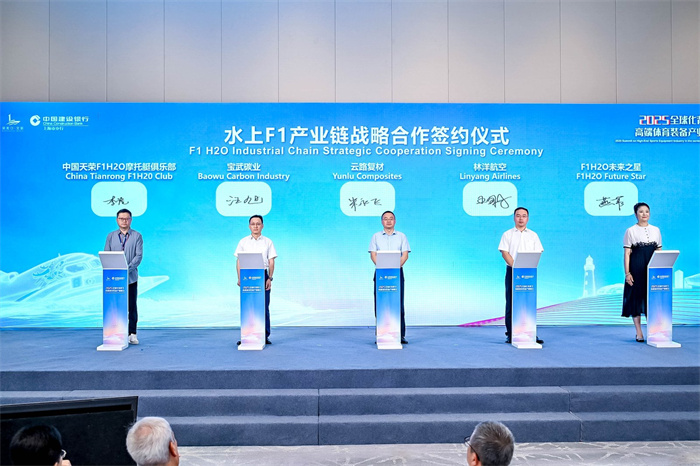 现场,水上F1产业链战略合作正式签约:中国天荣F1H2O摩托艇俱乐部、宝武碳业、云路复材、林洋航空、F1H2O未来之星达成战略合作,标志着F1H2O赛事平台将与国内新材料高端装备制造龙头企业携手共进,让赛事装备的技术创新与产业化落地生花。