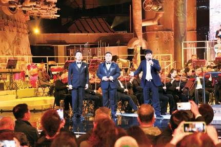 演出终章,两位知名歌唱家深情演绎文化节主题曲《山河永定》,高炉幕墙投射出西山永定河沿线的壮美画卷——从首钢园美景到卢沟桥的石狮,从灵山的林海到园博园的花海,让“家国长安”的主题具象化。最后,全场齐唱《歌唱祖国》,熟悉的旋律在高炉内部回荡,红色精神与未来愿景在此交融。