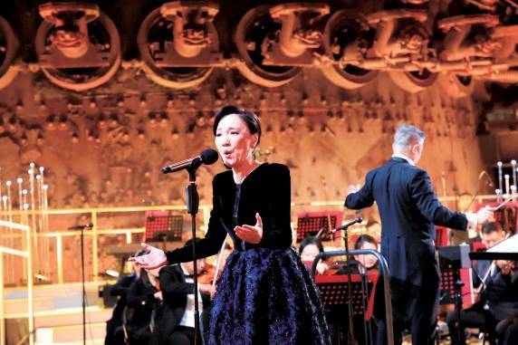 音乐会开篇“红色丰碑·山河记忆”以纪念中国人民抗日战争暨世界反法西斯战争胜利80周年为主题,用音乐复刻那段“山河浴血、众志成城”的烽火岁月。《松花江上》的悲怆旋律将观众拉回山河破碎的年代,《黄河怨》的泣血唱腔是哭诉更是呐喊,而《大刀进行曲》《游击队歌》的激昂节奏,瞬间点燃中华儿女的抗争豪情。当《保卫黄河》的旋律响起,台上台下齐声高歌,“风在吼,马在叫”的呐喊穿越时空,成为民族不屈精神的最佳注脚。“山河重光·新生交响”乐章,歌曲《南泥湾》的欢快旋律勾勒出自力更生的奋斗图景,《延安颂》的恢宏曲调歌颂中华民族的光明希望,原创情景诗朗诵《历史走向未来》则以深沉有力的文字,将历史记忆与今日成就衔接起来。