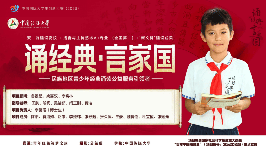 2023年,在中国国际大学生创新大赛中,我院“诵经典·言家国——民族地区青少年经典诵读公益服务引领者”项目荣获青年红色筑梦之旅赛道公益组全国金奖,这是我院在该项重大赛事中首次摘金,实现了重大突破。
