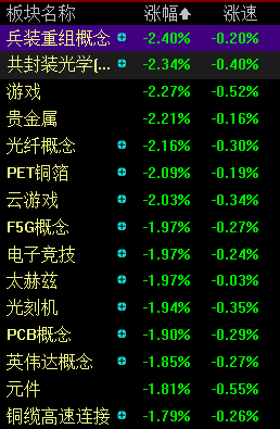09:50指数走弱,创业板指下挫跌逾1%,沪指跌0.15%,深成指跌0.65%。军工、贵金属、游戏等方向跌幅居前,市场下跌个股近3800只。