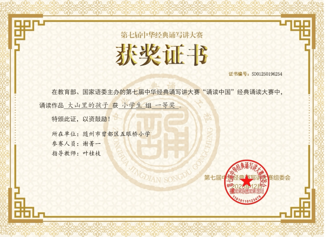 △8月26日,曾都区五眼桥小学谢菁一同学作为湖北省小学生组唯一代表跻身全国经典诵读大赛并获得一等奖。