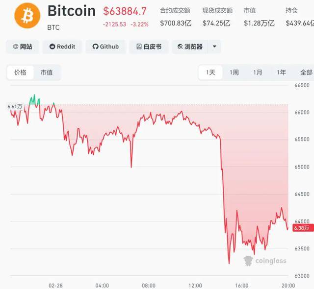 比特币在美以对伊朗开始空袭后直线美元两道关口,据CoinGlass数据,24小时内最低下探至63216.01美元,创近期新低,以太坊至28日20时30分跌幅超4.6%。