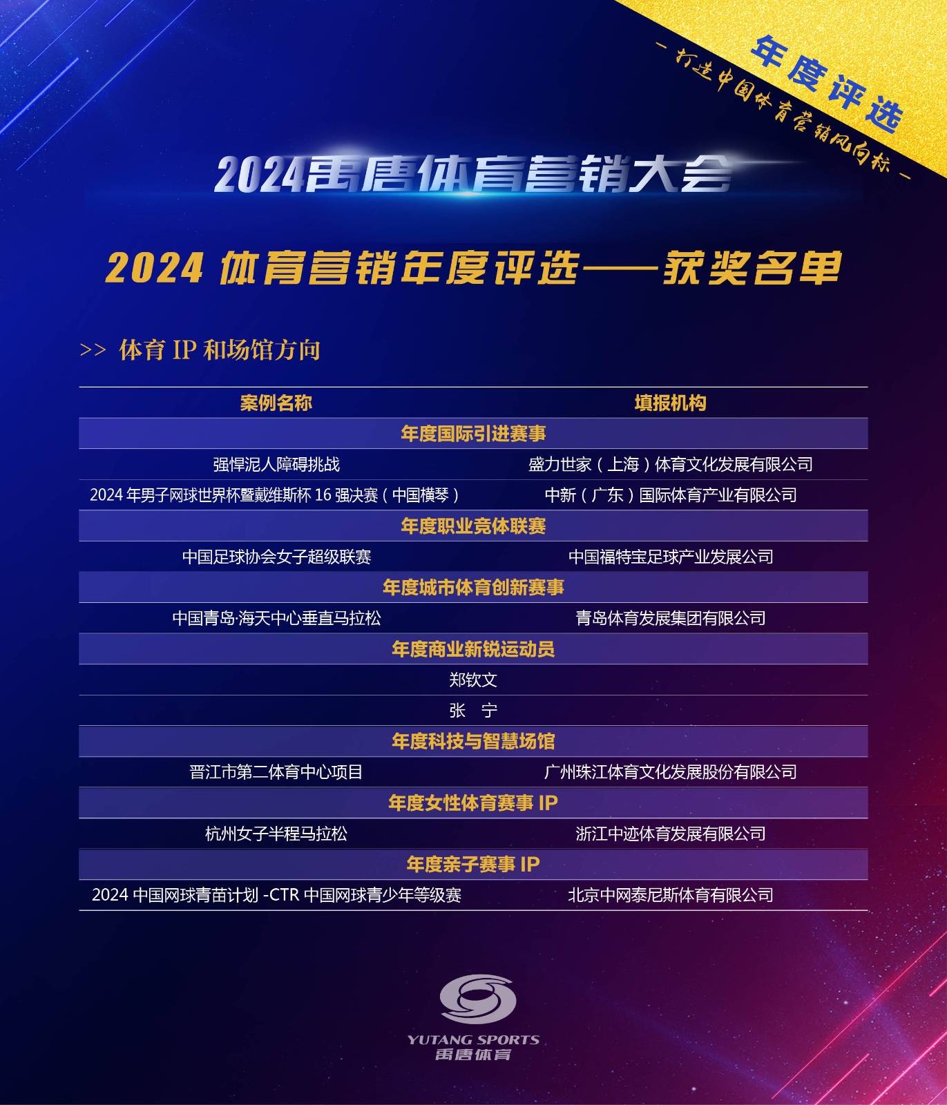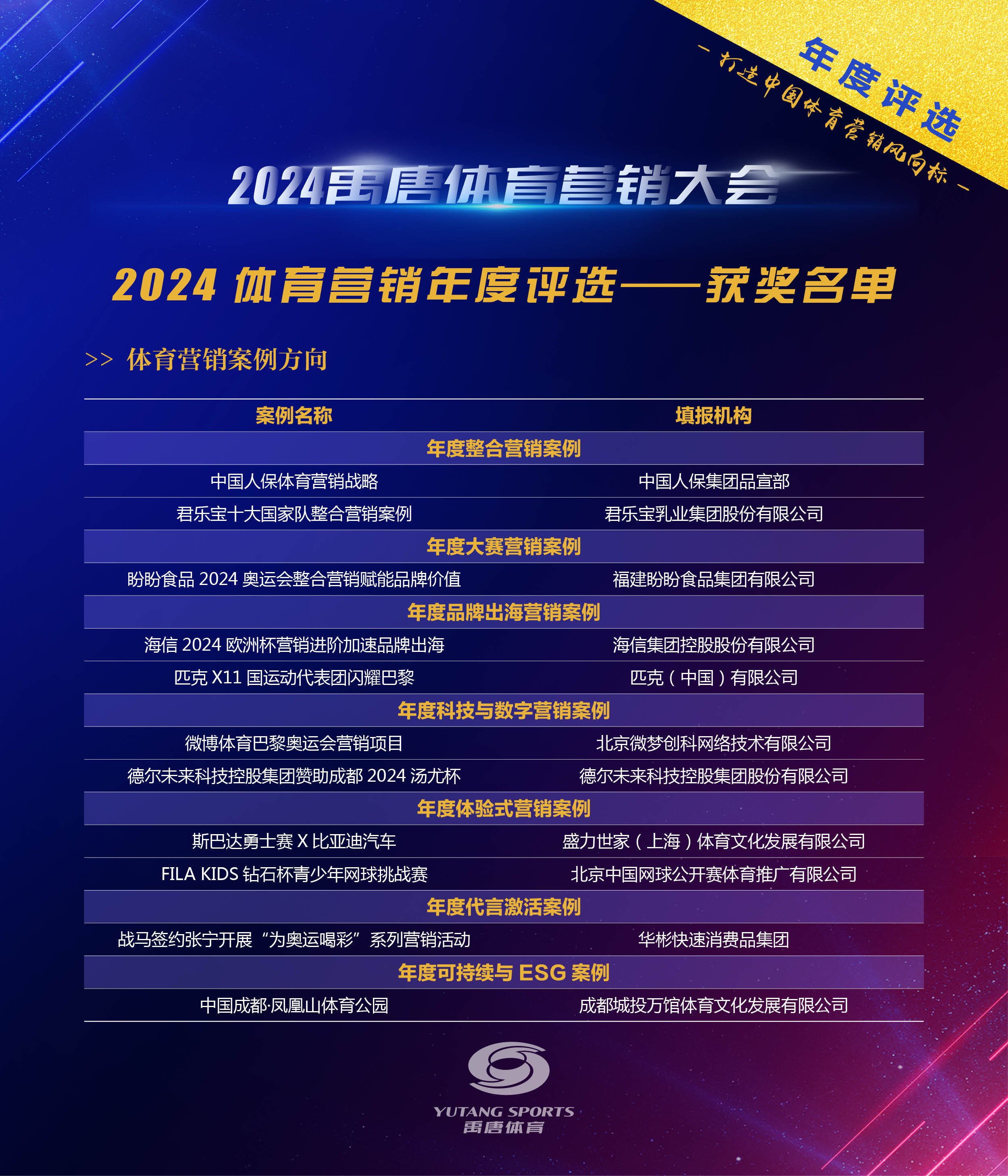 聚焦于“本土化·全球化”为核心主题,2024禹唐体育营销大会倾力打造体育营销年度评选,以此作为年度优秀实践成果的汇聚和行业精英交流平台,锚定2025年体育营销风向标,引领体育产业在新年度的发展航向和行业突破。