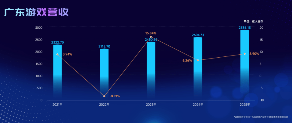 广东省游戏产业协会2025年年底发布的《2025广东游戏产业报告》数据显示,2025年广东游戏营收达2836.13亿元,同比增长8.9%;广东游戏产业年收入占国内游戏市场营收规模的80.85%;在全国上市游戏企业重点地区分布上,广东省以27家的数量高居第一。