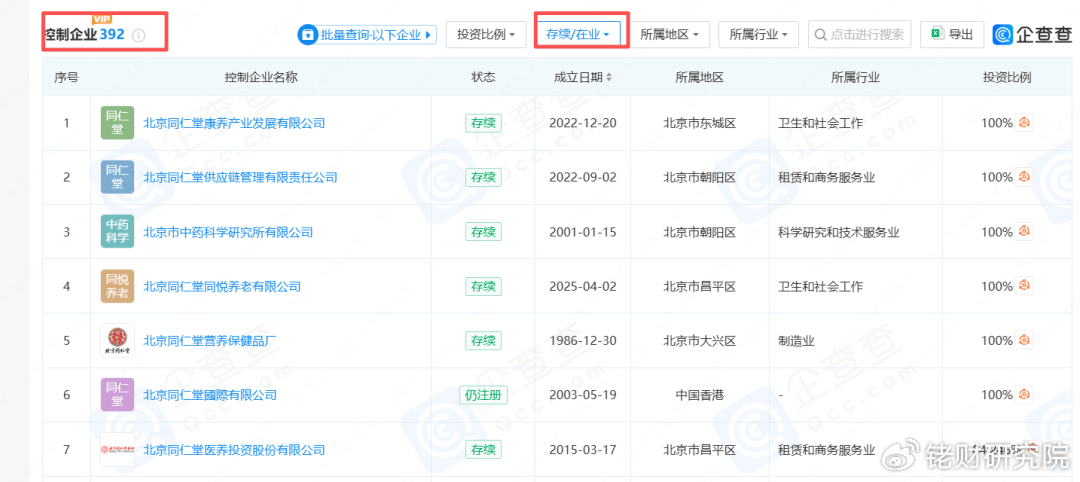 庞大的业务布局背后,是企业层级错综复杂的矩阵体系。企查查数据显示,截至2025年12月30日,北京同仁堂集团直接或间接控制企业达392家(存续/在业)。其中,分销商包括此次涉事的四川健康药业,还有北京同仁堂兴安保健科技有限责任公司、北京同仁堂化妆品有限公司等。