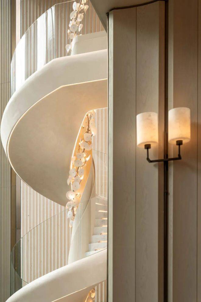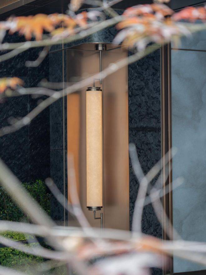 两侧典雅的云石壁灯,不仅照亮了归途,更以沉静的光晕抚平喧嚣,让业主整个归家路上充满仪式感。