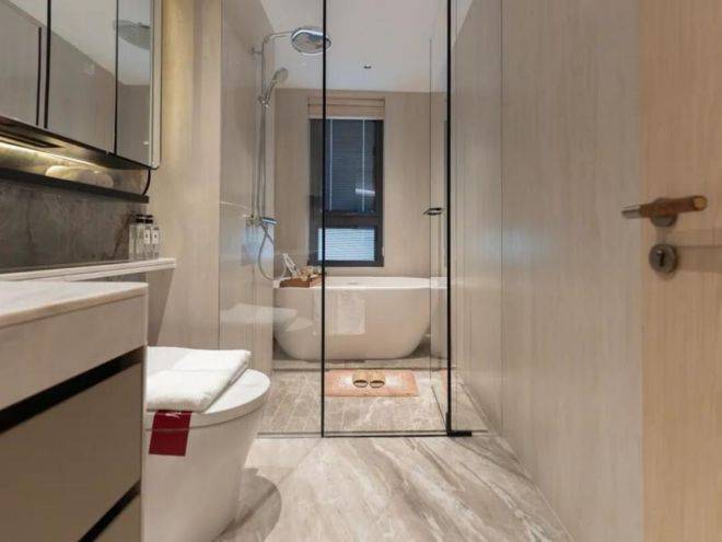 卫浴,杜拉维特/汉斯格雅洁具等国际一线品牌,石材的台面+美妆冰箱,契合女主人的喜好与生活习惯,一步到位。