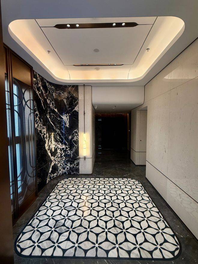 指引箭头与分割线,皆以同厚度的马蹄石精准镶嵌。于沉稳的暗色中勾勒出清晰利落的视觉节奏与秩序。
