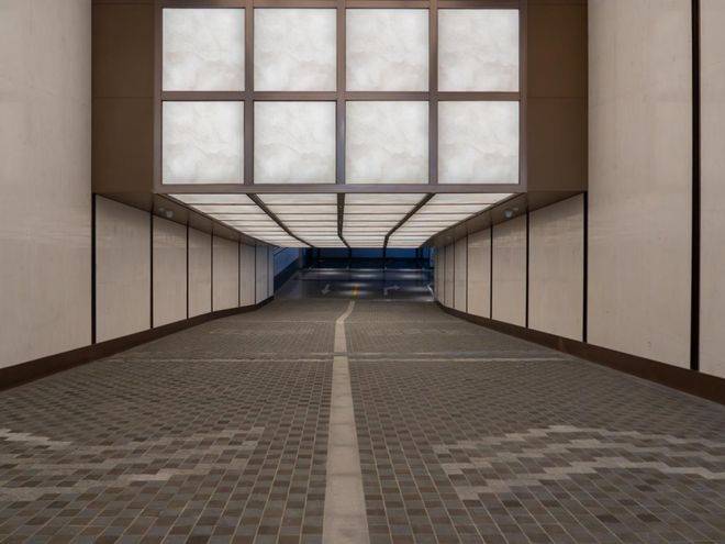 往里走,入口坡道的顶面,以纤细的金属线条勾勒出秩序的骨架,内嵌的透光云石玻璃,于细节处营造上海高端小区车库范本。