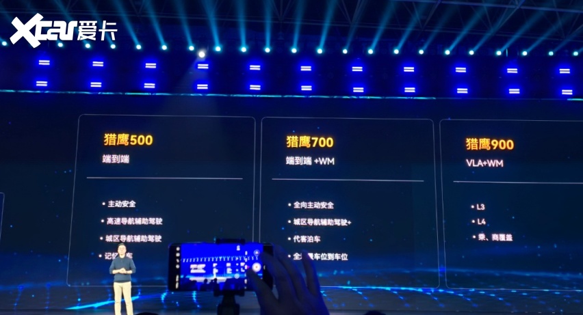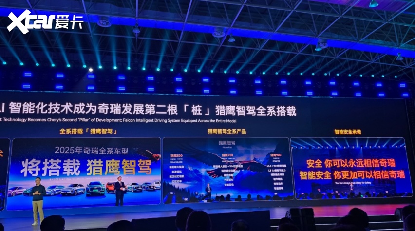 猎鹰 700 则承担着城区辅助驾驶主力方案的角色。在硬件上升级为 11V3R12U1L,引入激光雷达,并结合端到端模型与世界模型(WM),实现更完整的城区导航辅助驾驶能力。该版本已经覆盖车位到车位的导航辅助、代客泊车以及更复杂的城市路况处理,同时在主动安全上实现了全向覆盖。奇瑞在发布会上也明确表示,猎鹰 700 将成为后续城区辅助驾驶普及的重要载体。