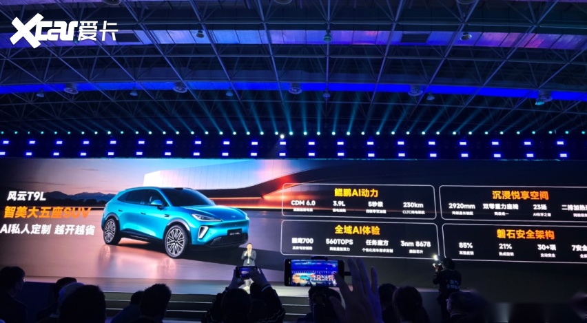 第一款车是风云 T9L。作为本次 AI 之夜最核心的量产车型之一,这款大五座 SUV,也是奇瑞鲲鹏 AI 动力和猎鹰 700 辅助驾驶的重要载体。
