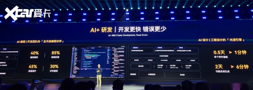 在研发环节,AI 被用于工程设计、编程和仿真。通过 AI 编程工具,开发效率和代码质量同步提升;在设计侧,CAD 设计智能体可以直接参与零部件和总成建模,把原本以天为单位的工作压缩到了分钟级。