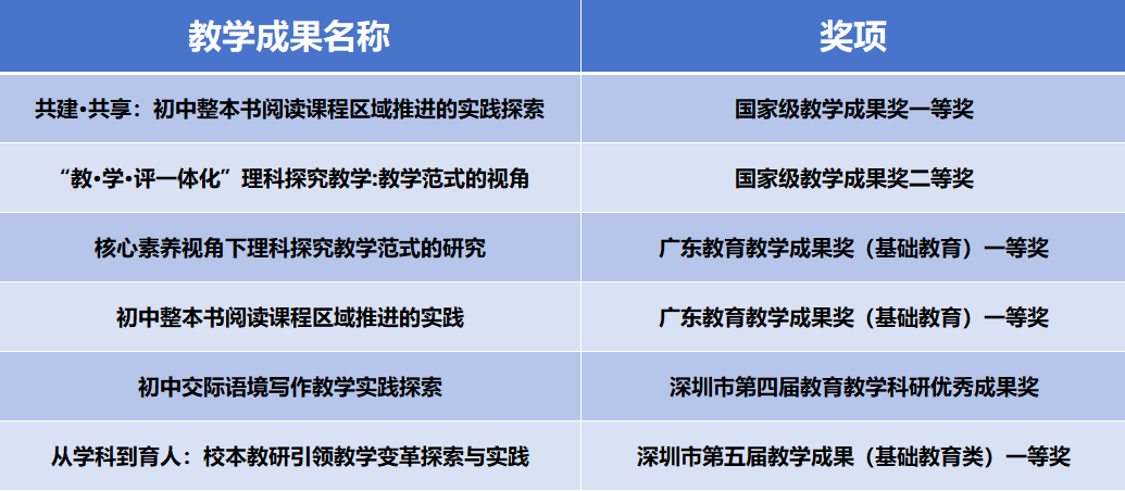 近年来,学校教师荣获市级以上教研教学成果奖6项(含国家级教学成果一等奖项,二等奖1项,广东省教育教学成果奖一等奖2项),主持区级以上立项课题共计28项;24人次获全国奖项,68人次获省级奖项,其中7名教师获得由教育部、省教育厅举办的教师技能类大赛一等奖,学校连续四年荣获深圳市青年教师教学能力大赛优秀组织单位。在文化浸润、制度建设的双重保障下,初中部教师队伍建设拥有了持续的造血能力。